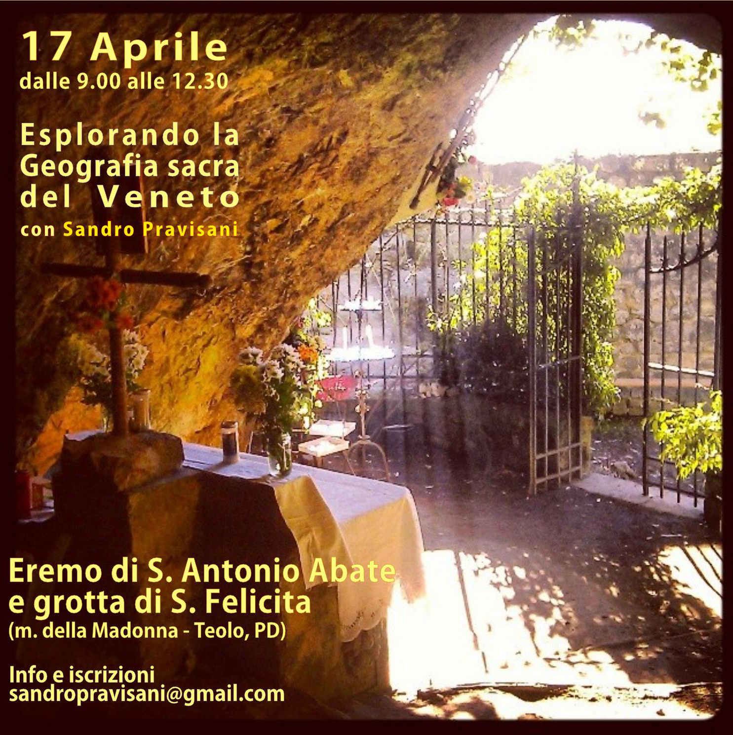 Saliremo sul monte della Madonna per un'esperienza alla grotta e chiesetta di Sant'Antonio Abate (Colli Euganei - PD). Dopo una sosta per il pranzo (al sacco), scenderemo nella pianura tra i colli Berici ed Euganei, dove ci recheremo alla Madonna della neve di Lumignano (VI) per visitare le misteriose incisioni visibili sulle colonne del porticato. Da lì, termineremo il percorso presso il sacello di San Teobaldo a Sossano (VI) dove morì San Teobaldo e dove si trova il centro della "Stonehenge" veneta.